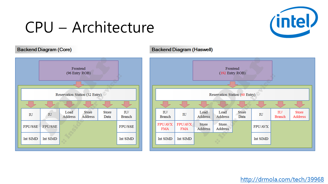 하지만 백엔드에서의 차이는 명확하다. 하스웰에서 백엔드 대역폭이 늘었다. 6개에서 8개로.