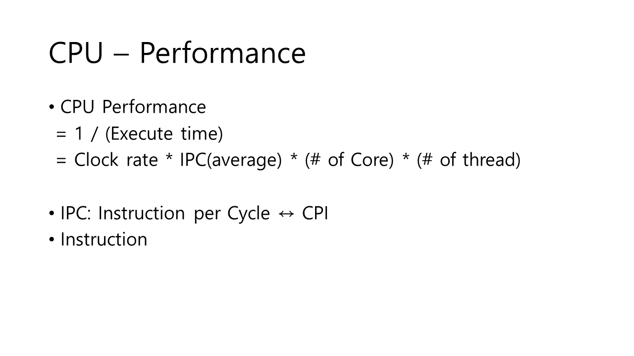 CPU 성능 = 실행시간의 역수 = 클럭 * IPC * 코어 * 스레드