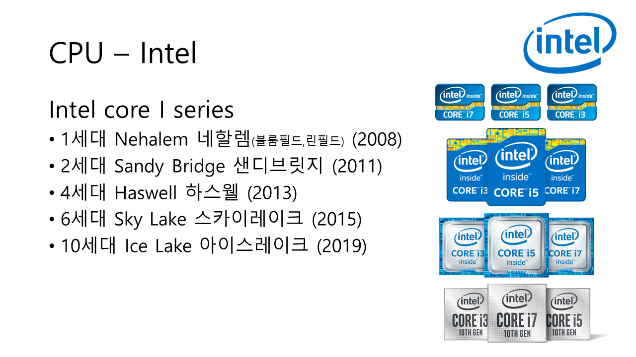 우선 인텔 CPU에 대해서 알아보도록 하자. 인텔 코어 시리즈 간략히 보자. 아키텍처가 변경된 제품군만 넣었다.