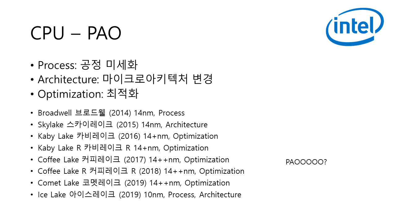 인텔은 코어 I 시리즈부터 틱톡 전략을 사용한다. 공정미세화와 아키텍처 변경.