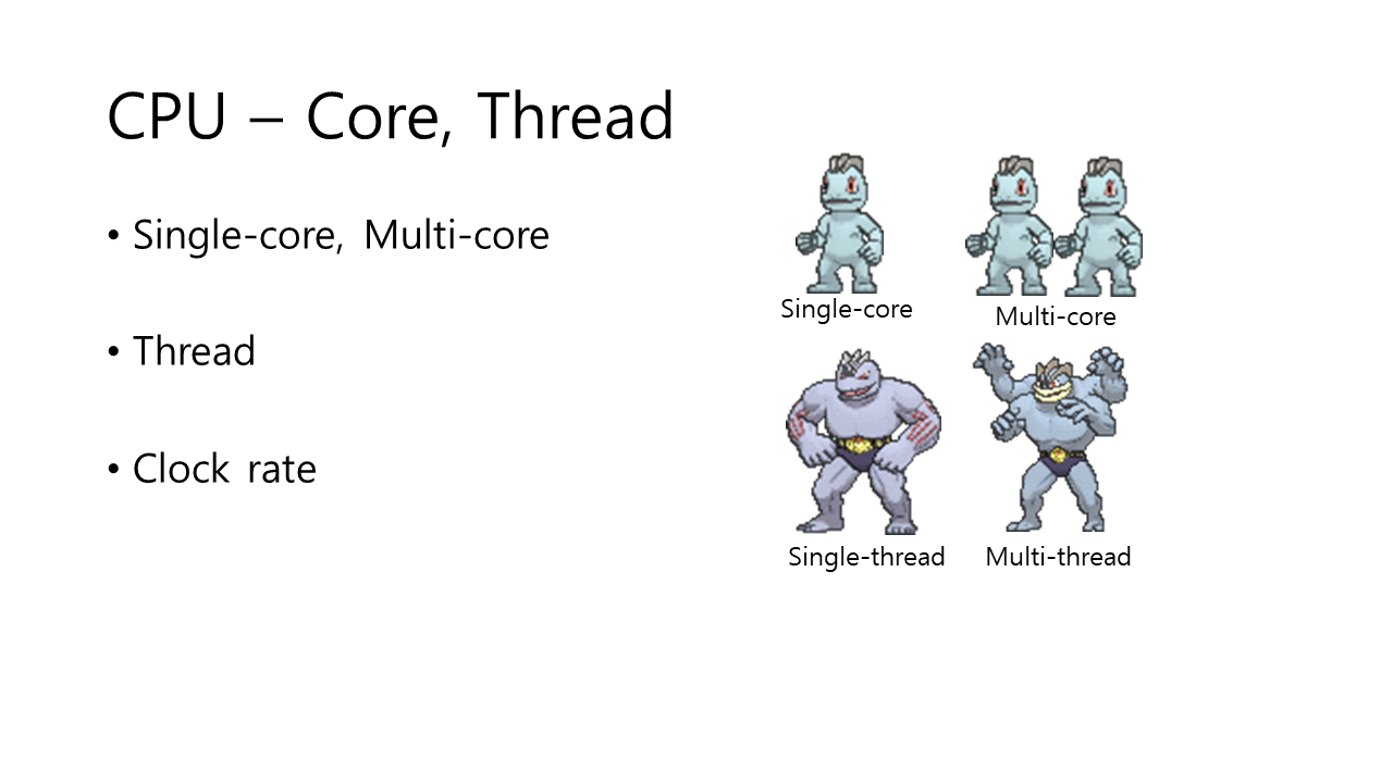 Single-core, Multi-core: 연산(일) 할 수 있는 자원(사람)