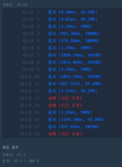 그래서 순회를 재귀말고 반복문으로 풀었는데 다른 테스트 케이스에 시간초과가 뜬다.