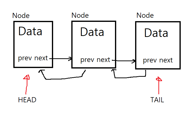 이렇게 연결만하면 처음과 끝을 모르기때문에 이를 알려줄 노드도 필요하다. 통상 HEAD, TAIL이라고 표시하고, NULL 값을 가리킨다. HEAD에서 가리키는 값은 첫 노드이고 TAIL은 마지막 노드이다. 노드가 아무 것도 없을 땐 HEAD와 TAIL은 아무것도 가리키지 않다가 노드가 생기면 그때부터 가리킨다. 그리고 HEAD가 가리키는 노드가 삭제되거나 새로운 값이 추가 되면(TAIL이 가리키는 노드가 바뀌면) 갱신해야한다.