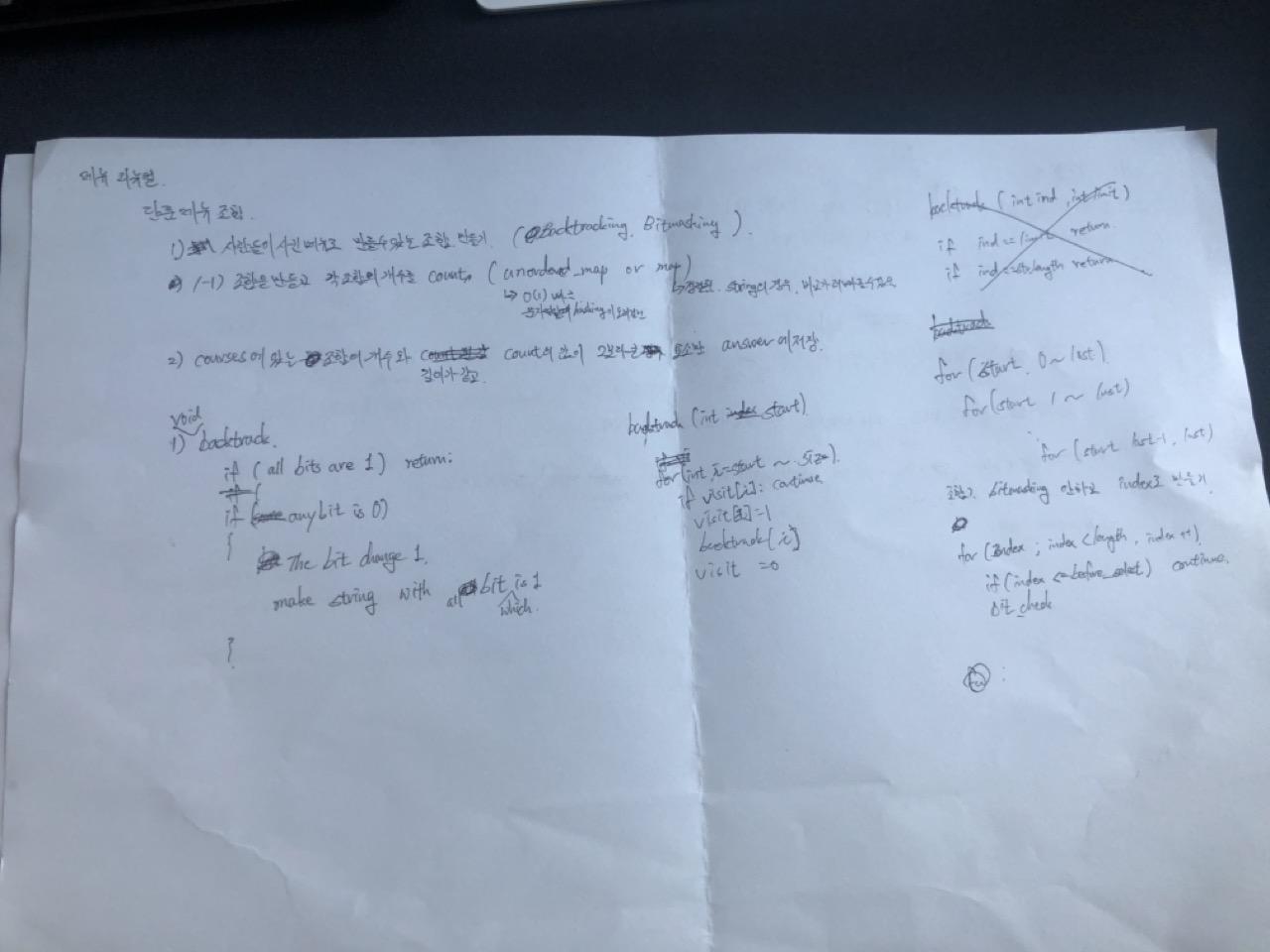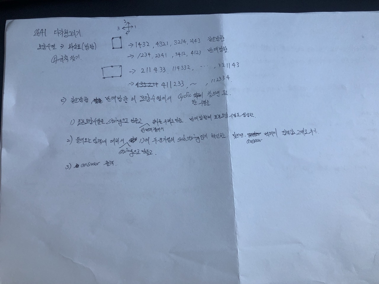 매 스터디마다 발표를 해야하기 때문에 나름 열심히 준비하고 있다. 아래 보이는 것처럼 문제를 읽고 접근 방식을 손으로 미리 적는다. 이 방식을 사용하는 이유는 먼저 생각을 정리할수 있기 때문인데 무턱대고 코딩한다음 고치는 것보단 이 방법이 평균적으로 시간이 적게 걸린다. 이렇게 적어놓은 것은 블로그에 거의 그대로 작성할수 있어서 좋기도 하다.