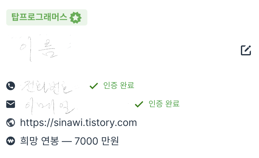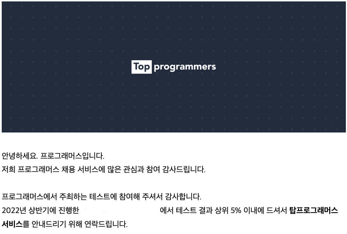 탑 프로그래머스 선정되었다고 메일을 받았다. 저게 상반기 때 이곳저곳 쓰면서 봤던 코딩테스트였다. 취업하고 거의 5개월이 지났는데 지금 메일이 오는게 이상해서 처음엔 믿진 않았다. 구글 폼을 작성하래서 무슨 내용이 있는지만 봤는데 딱히 뭐 내 정보를 캘만한 양식이 없어서 양식을 보냈었다. 한 일주일정도 지나니 아래 사진처럼 인증 뱃지가 달렸다.
