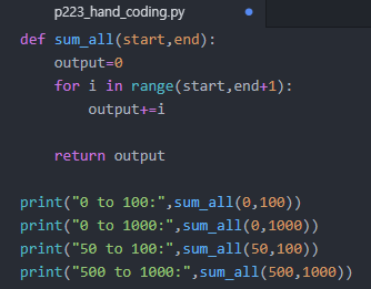 기본 미션: 223쪽 [직접 해보는 손코딩: 범위 내부의 정수를 모두 더하는 함수] 실행 후 코드가 입력된 화면 및 실행결과 화면 인증샷